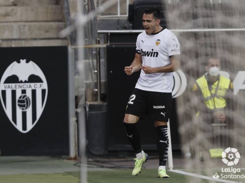 Dos goles de Maxi Gómez, que llevaba cuatro meses sin marcar, dan los tres puntos y la salvación al equipo de Mestalla. Salió con cinco centrales y la novedad de Kangin