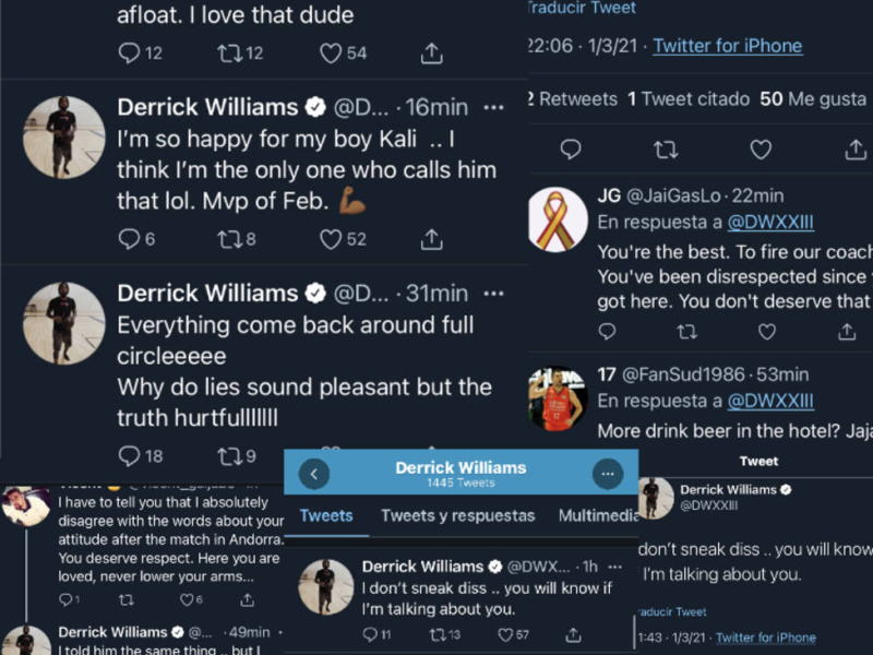 Sin embargo el jugador, desde su habitación de hotel en Turquía, acudió a las redes sociales para ofrecer su punto de visto en torno a lo que estaba sucediendo. Su primer mensaje fue: "soy demasiado bueno para ti, debería (o deberíamos) haber seguido solido", a lo que se desencadenó una catarata de comentarios, que el jugador no tuvo reparos de ir contestando sin aportar nombres. Un aficionado le dijo que estaba en desacuerdo con lo dicho por el entrenador y que Williams merecía respeto. El norteamericano respondió: "yo le dije lo mismo, pero no me voy a doblegar, no está en mi sangre". Otro de sus dardos fue: "todo vuelve alrededor de un círculo. Por qué las mentiras suenan tan bien, pero la verdad duele"