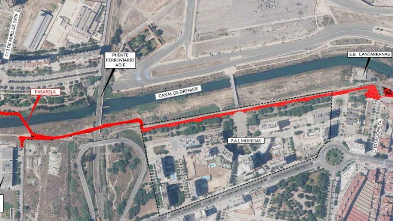En el margen derecho del antiguo cauce, el camino continuará por la zona que atraviesan las vías de ferrocarril que cruzan las vías de la Serradora, “que están pendientes de un proyecto estatal para soterrarlas”. Pasará por debajo del puente ferroviario a través de un paso inferior existente que se acondicionará para mejorar su accesibilidad y su integración ambiental y, seguidamente, por el PAI de les Moreres, hasta el edificio de Canta-ranes, donde se bifurcará en un itinerario ciclista y otro peatonal, el primero por la calle de l´Estacioneta y el segundo por el borde oeste del Puente de Astilleros.