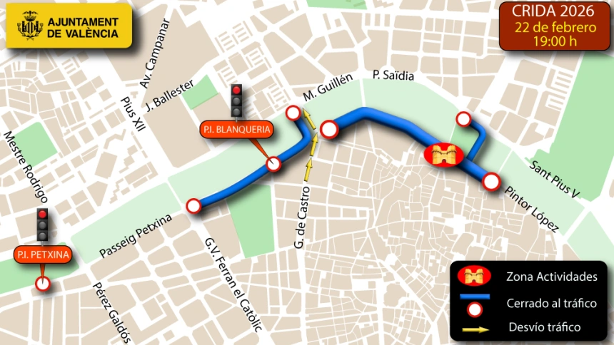 Ya por la tarde, se cortará el paso de vehículos por la marginal derecha del antiguo cauce del río Túria, incluidos los pasos inferiores, a partir de las 17:00 horas, hasta la finalización del pregón de la Crida.