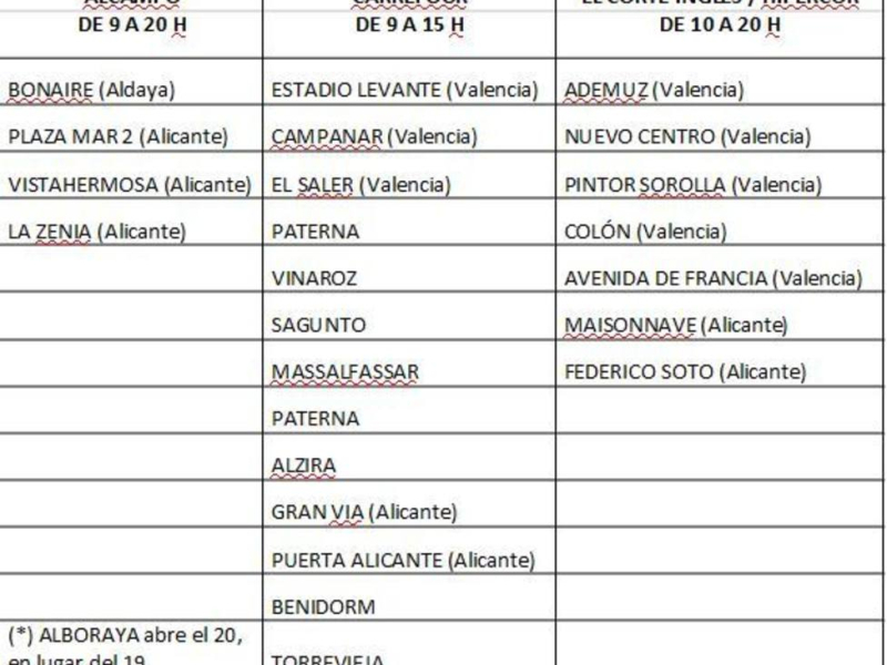 Carrefour abrirá el domingo de 9h a 15h en Estadio Levante, Campanar y El Saler de València; dos centros de Paterna; Sagunto; Massalfassar; Alzira; Vinarós (Castellón) y Gran Vía y Puerta Alicante, en Alicante.