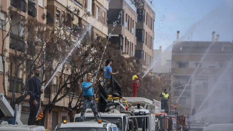 Así, camiones de limpieza y achique decorados con banderas y crespones negros han llenado los dos sentidos de la calle Orba pitando a su paso mientras eran recibidos entre aplausos por trabajadores y vecinos de Benetússer quienes han agradecido su trabajo: "Vosotros nos habéis salvado", han exclamado.
