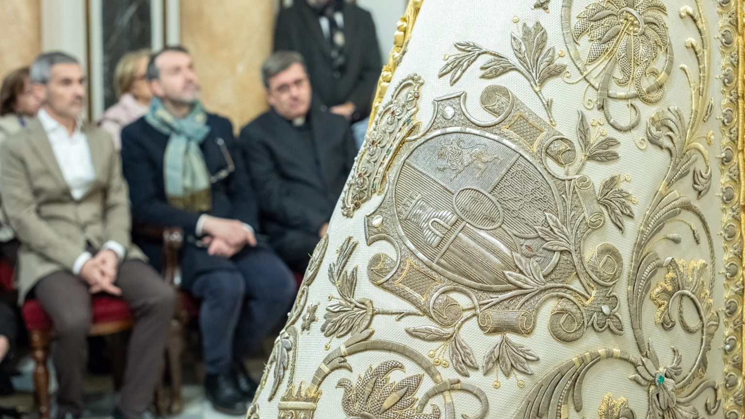 El proceso comenzó con un exhaustivo estudio de la obra, analizando su técnica de confección y estado. La documentación fotográfica histórica ha sido clave, sirviendo como guía para restablecer los patrones originales de 1915. Bajo las telas añadidas en restauraciones anteriores, se encontraron restos del tisú original, a partir de los cuales se ha confeccionado un nuevo tejido de piqué de tisú de plata con idénticas características de hilo y trama para pasar los bordados originales.