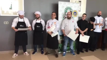 Caja Rural y Corderex, Mario Mera Gómez-Bravo, entregan el 'Premio Espiga' a la Mejor Receta de Cordero, dentro del XI Concurso de Cocina Corderex-Caja Rural de Extremadura, en la Escuela de Hostelería. El premio ha correspondido a Victor Encinal del Restaurante Castillo de Arguijuela.