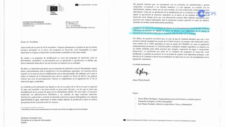 El Gobierno de Fernández Vara eliminó toda la documentación relativa al regadío de Tierra de Barros y se comprometió a no iniciar la ejecución del proyecto hasta que se resolvieran las dudas de la Comisión Europea. Es lo que se desprende de una carta que ha hecho pública el consejero de Mundo Rural de la Junta, Ignacio Higuero, enviada por un miembro de la Comisión Europea a Vara, el ministro Planas y la ministra Teresa Ribera, y que tiene fecha de diciembre de 2021; y en la que agradece a Vara la paralización del proyecto.