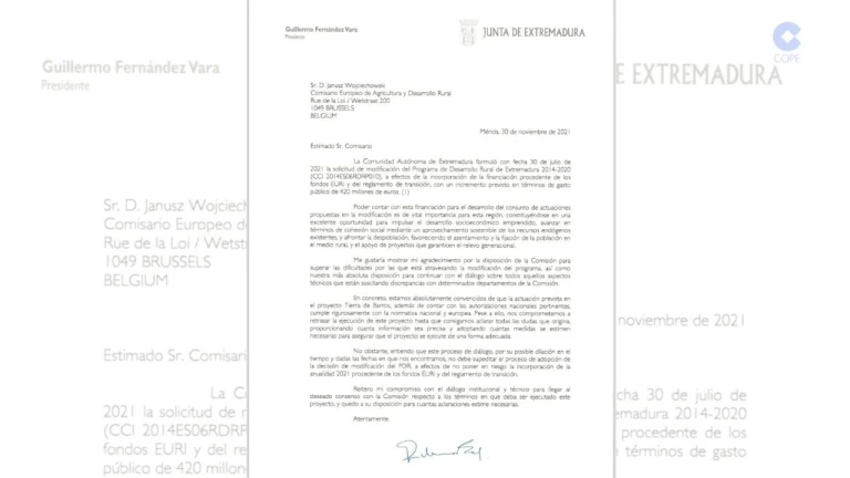 COPE ha tenido acceso a la carta enviada por Fernández Vara al comisario de Agricultura de la Comisión Europea, en noviembre de 2021, sobre el regadío de Tierra de Barros.