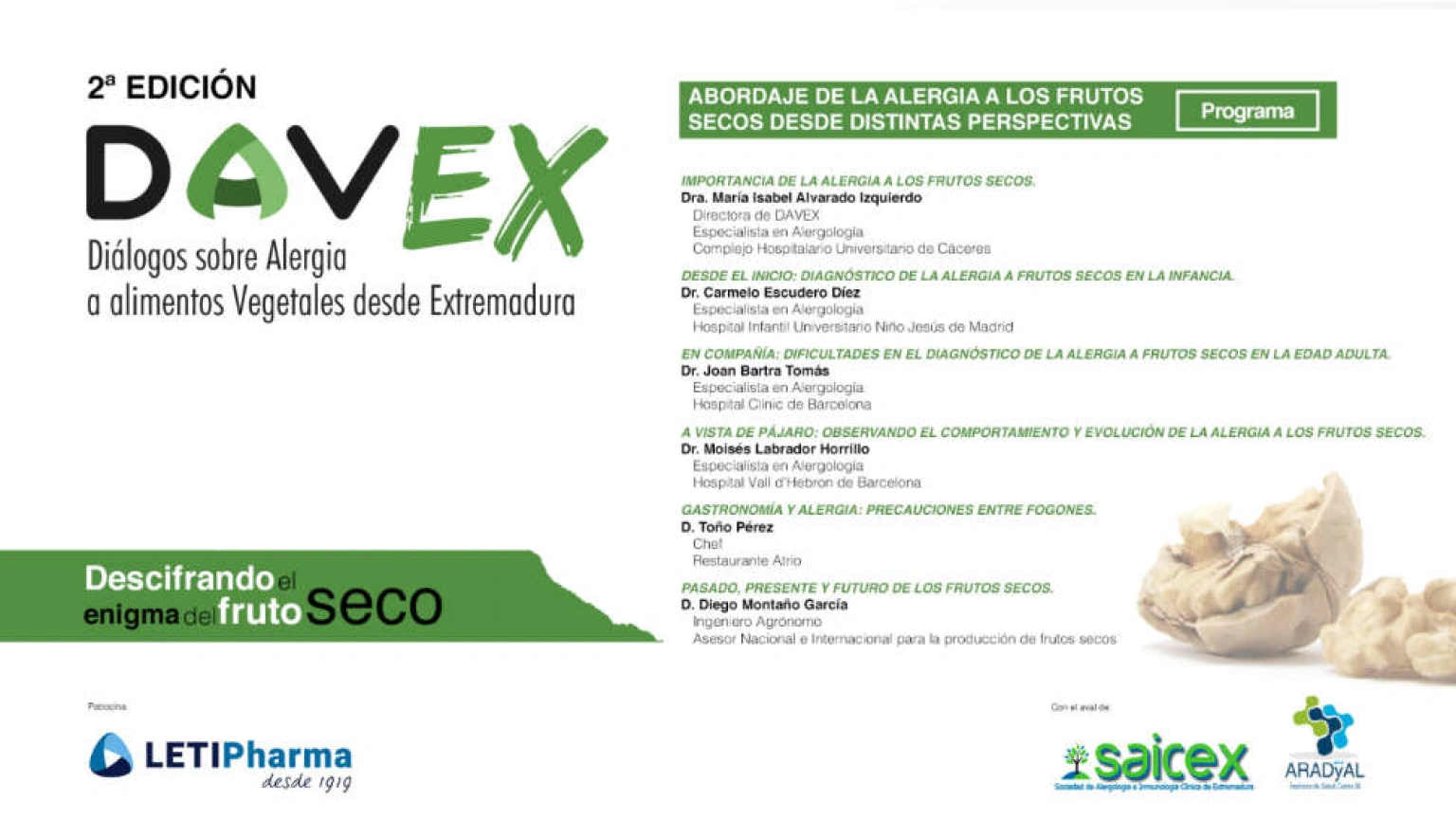 Hoy, 7 de mayo, tiene lugar la 2ª Edición de los DAVEX (Diálogos sobre Alergia a alimentos Vegetales desde Extremadura), que organiza la Sociedad de Alergología e Inmunología Clínica de Extremadura. En esta ocasión el evento se centrará en el abordaje de la alergia a los frutos secos desde distintas perspectivas.