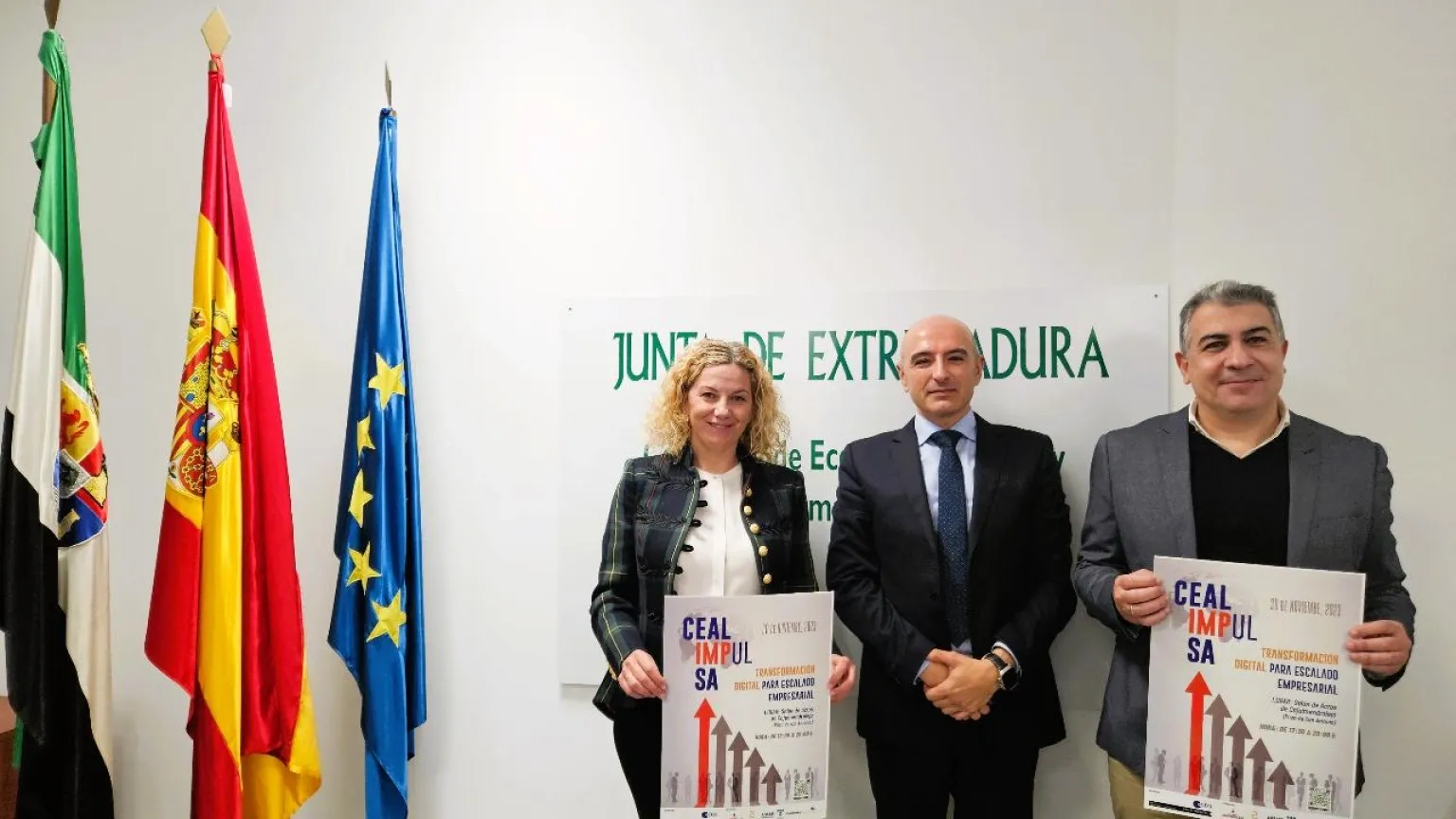 La Secretaría General de Transformación Digital de la Junta y la Coordinadora de Empresarios de Almendralejo (CEAL) han presentado el primer Laboratorio de Innovación Digital: 'Transformación Digital para el Escalado Empresarial', que tendrá lugar en Almendralejo el día 30, de 17,30 horas a 20,30 horas en el salón de actos de Cajalmendralejo. a la presentaciób, celebrada en Mérida, acudieron el secretario general de Transformación Digital; la presidenta y un directivo de CEAL, Miriam Lázaro y Diego Franco, respectivamente.