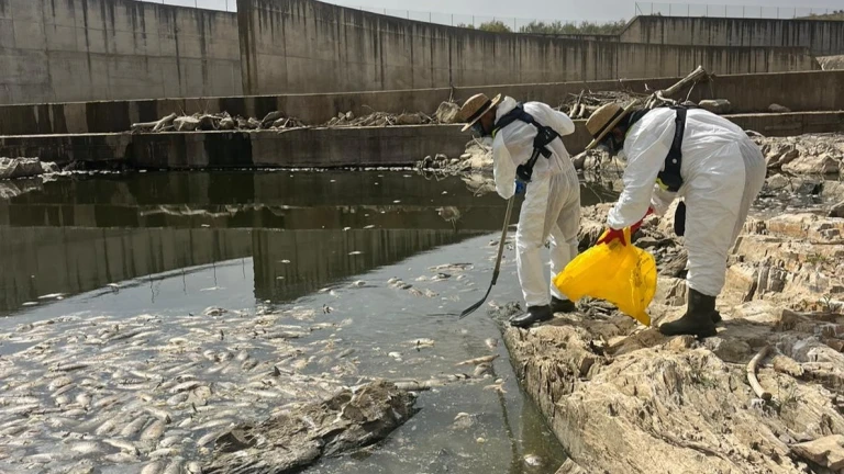 La Confederación Hidrográfica del Guadiana retira peces muertos del embalse de Los Molinos