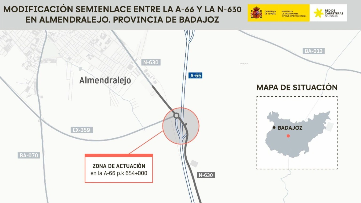 Mapa de la modificación del semienlace de la A-66 y la N-630 en Almendralejo