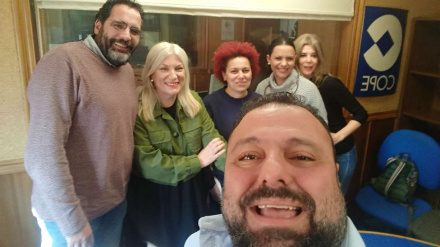 Borja de Lope y Abel Hernández con el equipo de Herrera en COPE Badajoz