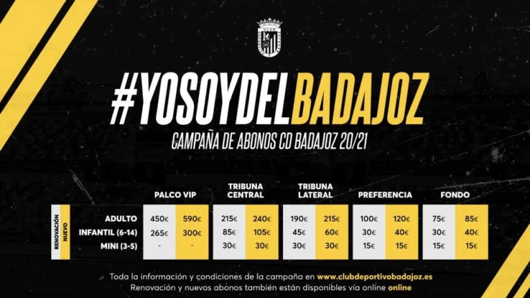 Los abonos podrán adquirirse de forma presencial en el estadio Nuevo Vivero desde el 19 de agosto. Imprescindible cita previa en este enlace: www.clubdeportivobadajoz.es/cita-previa. Horario: Lunes a viernes de 8h a 15h.