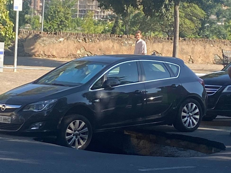 Esta mañana de jueves, sobre las 9:00 horas, se ha abierto un tremendo socavón en la avenida Ramón y Cajal de Badajoz, frente al Hotel Zurbarán y muy próximo al Instituto Castelar. Los servicios municipales se han visto obligados a retirar un automóvil que había quedado balanceándose en el vacio. Un corrimiento de tierras por una fuga de aguas parece ser el motivo.