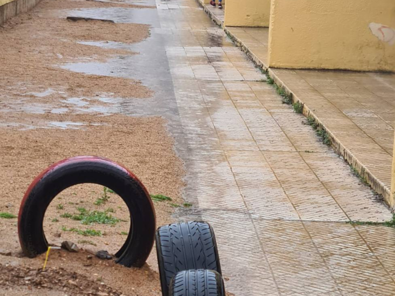 En el patio de Educación infantil existen múltiples barreras arquitectónicas, escalones, bases de árboles talados y hasta hierros que sobresalen de paredes semiderruidas. Además en este patio, que también es usado por las familias a diario, hay dos sumideros pequeños insuficientes y atascados, lo que produce una inundación completa del espacio los días de lluvia y la imposibilidad de atravesarlo sin mojarse.
