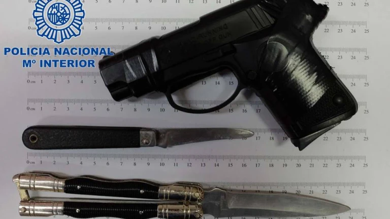 Pocos minutos más tarde, sobre las 13:00 horas, uno de los indicativos que participaba en el dispositivo de localización de estas personas, observó a dos individuos que coincidían plenamente con la descripción física aportada, motivo por el que procedieron a su identificación y cacheo de seguridad, momento en el que localizaron entre sus pertenencias, una pistola de color negro simulada, navaja tipo mariposa, navaja de color negra, varios teléfonos móviles y dinero en efectivo.