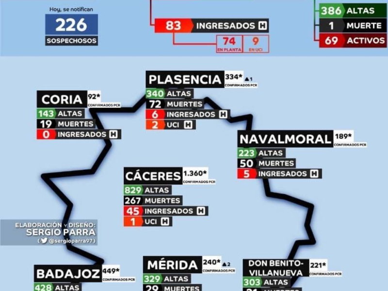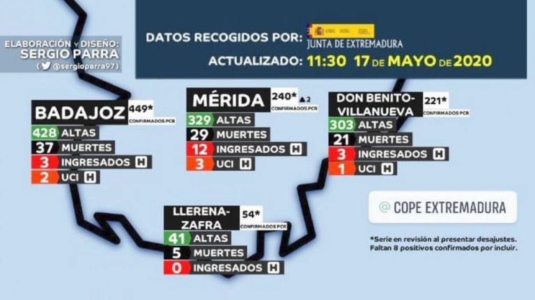 Ninguna de las áreas de Salud pacenses ha registrado fallecimientos por COVID19 en las pasadas 10 jornadas. En la última, además solo han resultado positivos con PCR 2 sospechosos