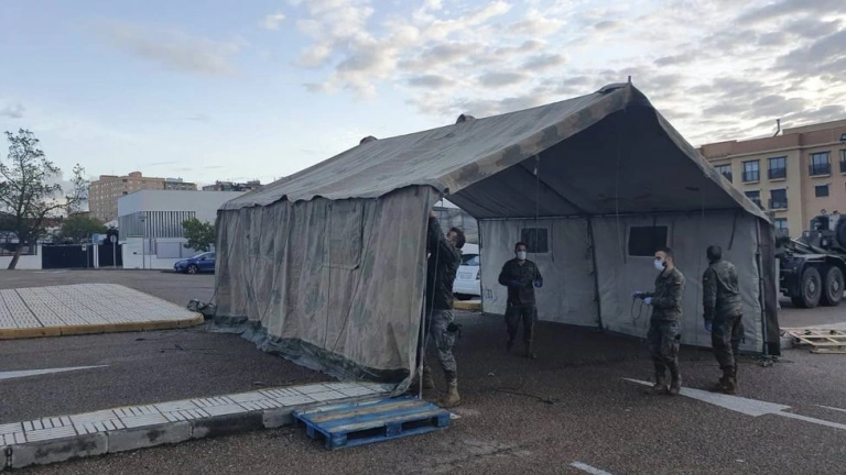 La Brigada Mecanizada Extremadura XI viene colaborando con las autoridades civiles en lo que se ha dado en llamar Operación Balmis, para el control del coronavirus y aplicación del decreto que rige el Estado de Alarma. Esta mañana un destacamento de esta Brigada localizada en el Cuartel General Menacho de Bótoa ha comenzado a levantar esta estructura en el aparcamiento del edificio de especialidades y recueración, conocido en la capital pacense como la "L".