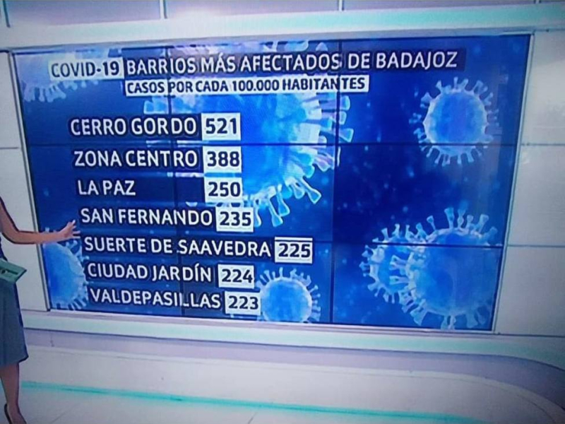 Tras las relación de algunos datos epidemiológicos ofrecidos por el Vicepresidente Segundo y Consejero de Sanidad de la Junta, José María Vergeles, la preocupación (cuando no el pánico) se ha extendido entre los habitantes de la capital pacense, especialmente entre los Barrios más afectados. Sobre todo tras ver gráficos como este del Canal Autonómico: