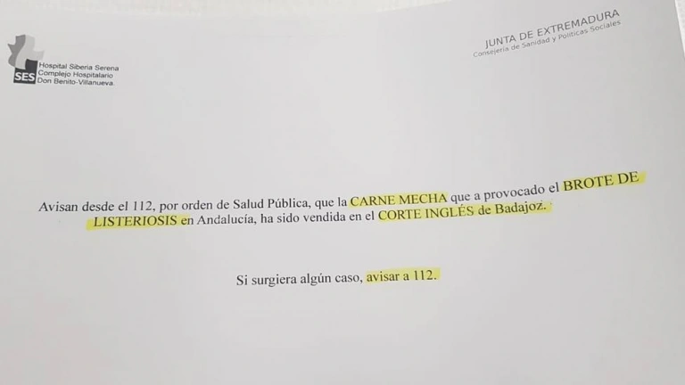 En el momento del inicio del brote, el SES informó al 112 de que el consumo de carne de la marca šLa Mecháš podía considerarse antecedente epidemiológico como parte de la historia clínica cuando los profesionales atendieran a pacientes con síntomas compatibles con esa enfermedad, tanto si se hubiera consumido durante una estancia vacacional en Andalucía como si hubiera sido adquirida en un establecimiento de la cadena El Corte Inglés en Badajoz, tal y como había transmitido la Agencia Española de Seguridad Alimentaria.
