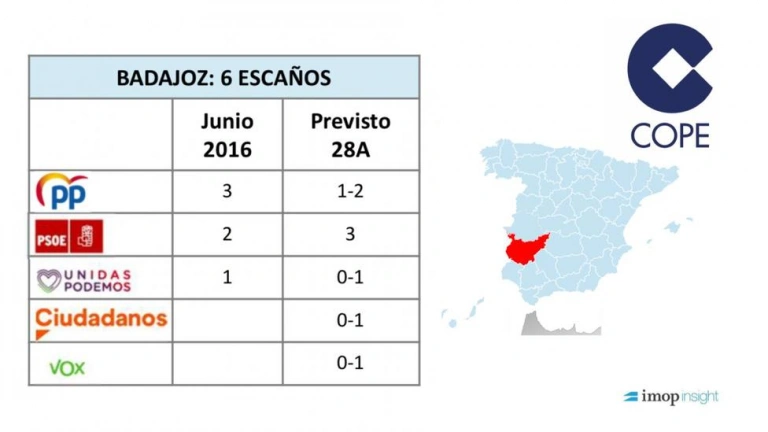 Una de esas provincias es la pacense donde los socialistas volverían a ser la fuerza más votada y obtendría 3 diputados. Los otros escaños que le corresponden a la provincia de Badajoz son una verdadera incognita. Parece hecho que el PP obtendría un escaño y está en duda el segundo. El sexto pudiera caer de cualquier ladoVox, Ciudadanos o, incluso, Unidas Podemos revalidaría el escaño de Amparo Botejara.