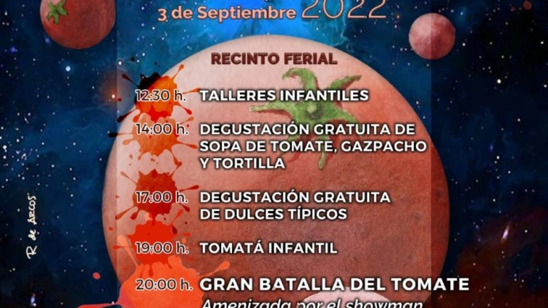 A las siete de la tarde está previsto que empiece ‘la tomatá’ infantil con una batalla de tomates solo para menores y una hora después, sobre las 8 de la tarde, comenzará la gran batalla de tomates que quiere ser el divertido colofón a toda la jornada de actividades. Para esta batalla de tomates se han preparado unos 12.000 kilos de tomates maduros, y el encargado de amenizar musicalmente los tomatazos será Carlos Moreno ‘El Pulpo’.
