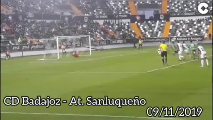 Isma Gil, portero del Sanluqueño paró ayer un penalti a Heber. Hace menos de un año Gil estaba en el Villanovense y Pena en el Melilla, y pasó lo mismo.