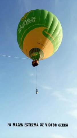 El mentalista extremeño Víctor Cerro se libera de una camisa de fuerza colgado de un globo