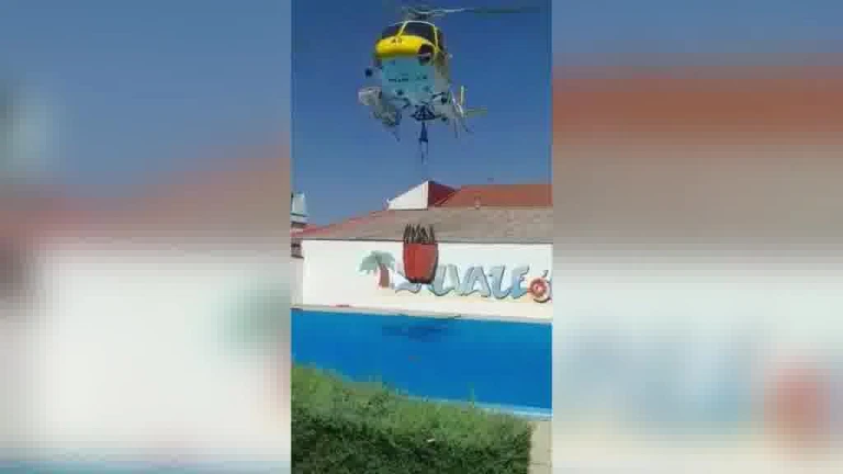 Helicóptero cogiendo agua de una piscina para sofocar un incendio en las proximidades de Salvaleón