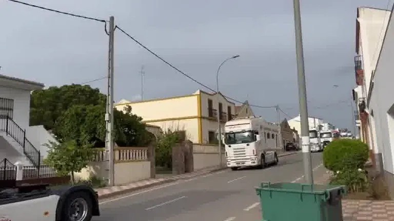 Una caravana de camiones atraviesa Oliva de la Frontera en su quinto día de paro