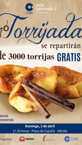 El domingo 2 de abril a las 17:30 horas comenzarán a repartirse este típico dulce cofrade en la plaza de España de Mérida. Se repartirán torrijas hasta que se agoten.