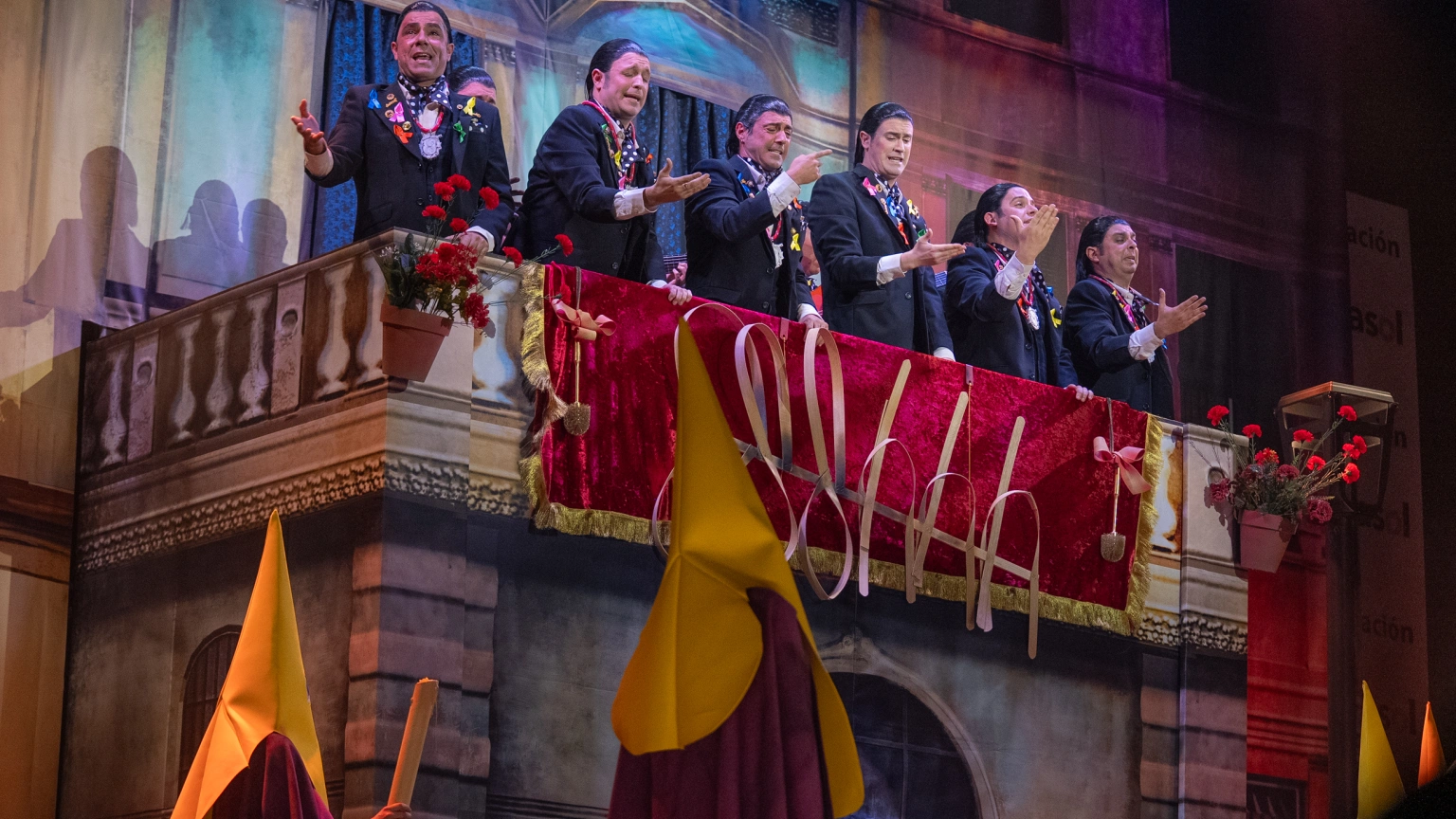 Su puesta en escena recrea a los componentes asomados a un balcón, donde entre coplas y silencios provocan carcajadas constantes en el patio de butacas, demostrando que el ingenio y la guasa siguen siendo armas poderosas en la chirigota.