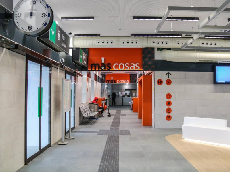 Se ha mejorado la megafonía y el mobiliario de la zona de anderes. En la zona exterior ya se puede ver la nueva escalera, además de una rampa peatonal, así como las marquesinas de taxi y de acceso al edificio.