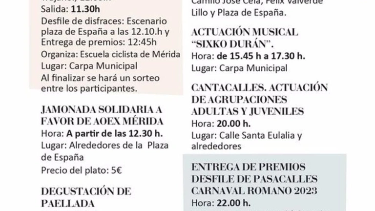 Tras ello, una ‘jamonada’ solidaria a favor de la Asociación Oncológica de Extremadura de Mérida, una degustación de paella en la Plaza de España y la actuación musical de Sixko Durán en este mismo espacio suponen la antesala del gran desfile de pasacalles del Carnaval Romano.