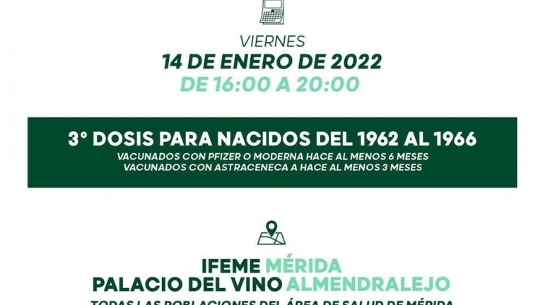Este viernes están llamados a la tercera dosis de la vacuna contra el covid los nacidos en 1975 y también los nacidos entre 1962 y 1966 y que pertenezcan al área de salud de Mérida.
