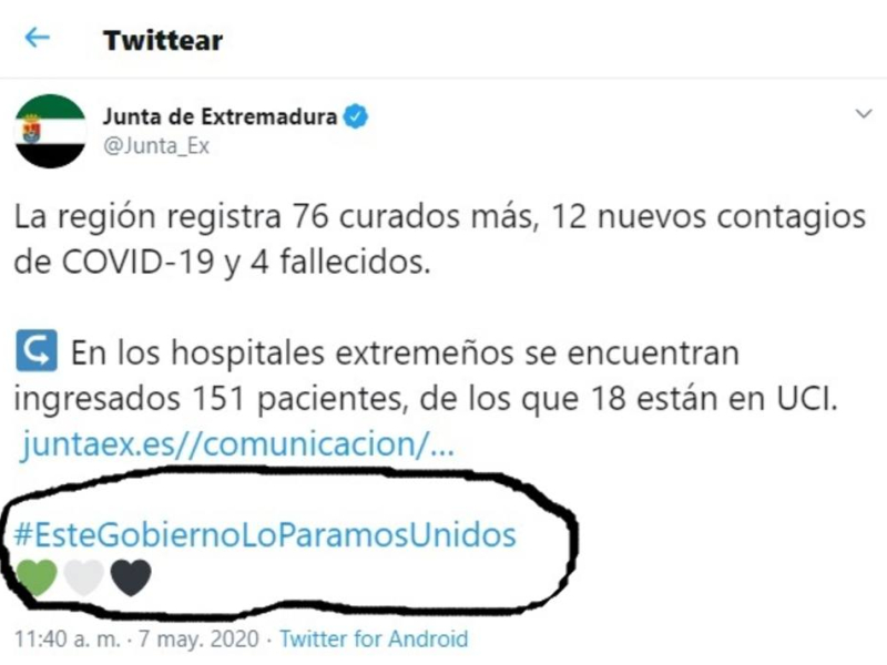 El Gobierno extremeño anunciaba las cifras de la incidencia del COVID-19 en la región de este jueves, 7 de mayo, con un enlace a su página web oficial donde ofrecían todos los detalles. Las redes sociales reaccionaron rápidamente al observar cómo el hashtag utilizado por el Ejecutivo regional, presidido por el socialista Guillermo Fernández Vara, era '#EsteGobiernoLoParamosUnidos' cuando el que en realidad utilizan, tanto el Gobierno de España como los gobiernos regionales del PSOE, es '#EsteVirusLoParamosUnidos'