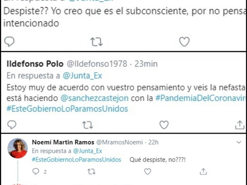 Los usuarios en redes sociales no han tardado en reaccionar ante este tremendo error del encargado de publicar en Twitter las diferentes noticias y anuncios del Ejecutivo regional. Así, se pueden leer reacciones preguntándose si se trata "de un despiste" o criticando la gestión del Ejecutivo de Pedro Sánchez y compartiendo el hashtag utilizado erróneamente por la Junta de Extremadura.
