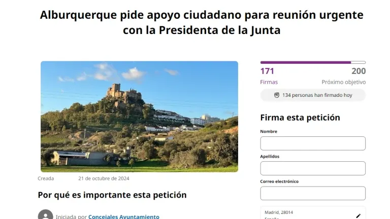 La iniciativa, que ya cuenta con más de 170 firmas, quiere propiciar este encuentro, que ya han solicitado por diferentes cauces formales, según señalan desde el Gobierno Municipal de Alburquerque, sin obtener respuesta. Con el mismo, quieren transmitir "los graves problemas que afectan" al municipio, dificultades que "están obstaculizando su desarrollo económico y social" conforme indican en la propia petición.