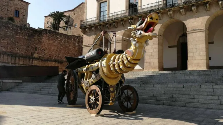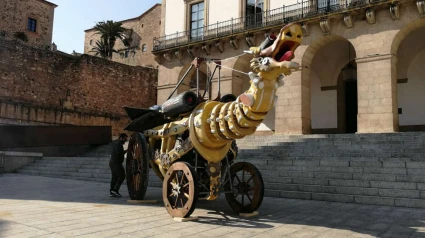 En la capital cacereña ya está todo preparado para celebrar al patrón: San jorge. Hoy se quema el dragón. Un dragón que ya puedes ver en la Plaza Mayor. El desfile partirá a las 20:00 horas desde la Ronda de la Pizarra. Te contamos todos los detalles del desfile y de la representación de la Reconquista de la ciudad en Herrera en Cope.