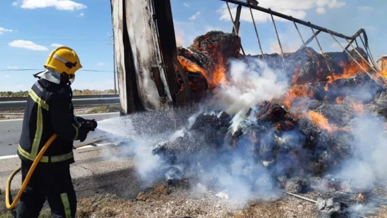 Cortada la autovía A-66 por el incendio de un camión que transportaba paja