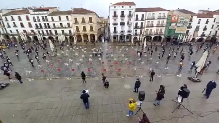 Los hosteleros de Cáceres exigen indemnizaciones por inactividad con una performance en la Plaza Mayor