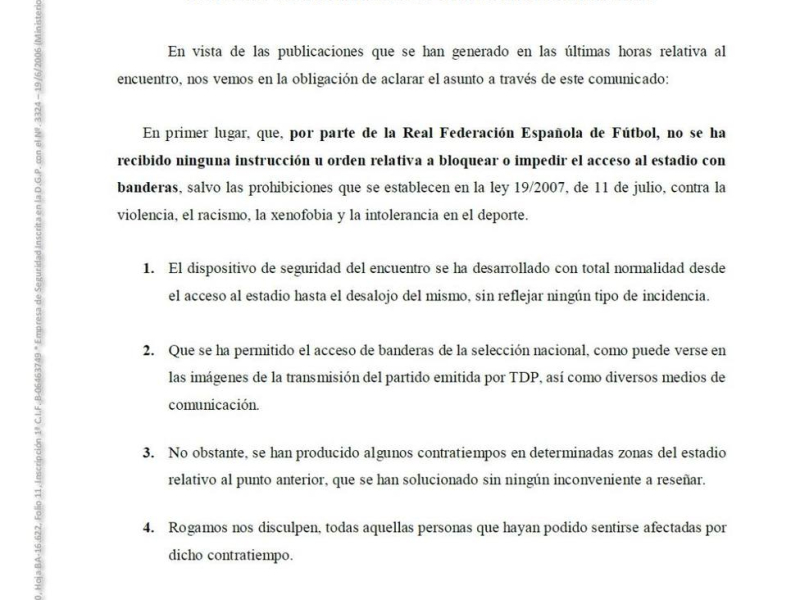 En un primer lugar se informó que las banderas que se quisieron introducir al estadio contenían alguna simbología prohibida, aunque es algo que niegan los aficionados que insisten en que eran "banderas de España normales y corrientes":