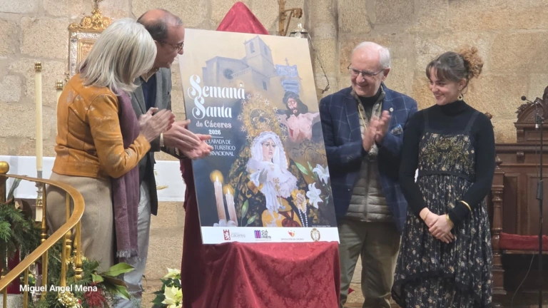 La Semana Santa de Cáceres 2026 ya tiene imagen oficial. El cartel, obra de la joven artista cacereña Adriana Camper Martín, se titula 'Lo que el mundo necesita' y ha sido presentado este sábado en la iglesia de San Juan. En el acto, el alcalde Rafa Mateos ha invitado a las cofradías a implicarse en el 40 aniversario de Cáceres como Ciudad Patrimonio de la Humanidad.