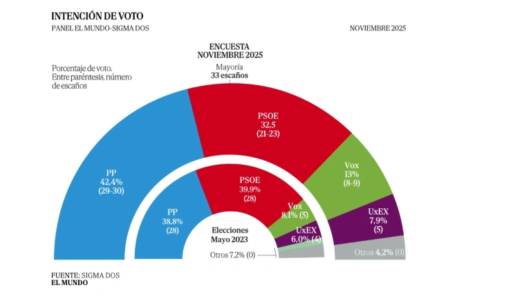 Sigma Dos le da 29 o 30 escaños a Guardiola, lejos de la mayoría absoluta; hunde al PSOE, en la misma línea que el CIS, entre 21 y 23; y dispara a Vox hasta los 8-9 diputados. Unidas por Extremadura obtendría 5.