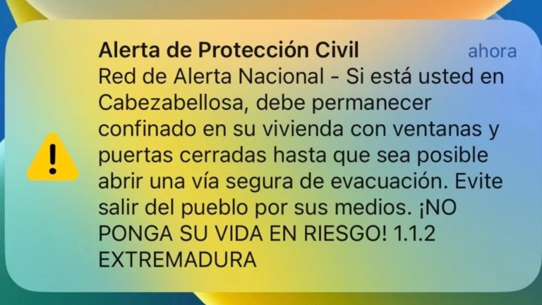 El Centro de Urgencias y Emergencias 112 de Extremadura ha enviado un mensaje masivo de ES-Alert para que aquellas personas que se encuentran en Cabezabellosa (Cáceres) permanezcan confinadas en sus viviendas con puertas y ventanas cerradas hasta que sea posible una vía segura de evacuación.
