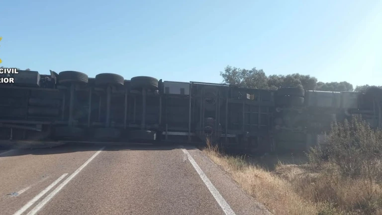 Según ha informado la Central 062 de la Guardia Civil, el siniestro se ha producido en torno a las 10:30 horas, cuando un vehículo articulado ha volcado por causas que aún se investigan.