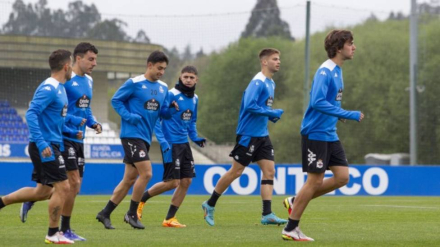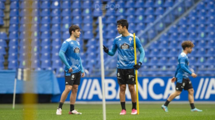 Manuel Pablo y Fran analizan al delantero del Fabril, que se entrena con el primer equipo por las bajas de Quiles y Miku