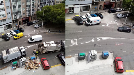 Inés Rey apunta a una mejora notable en la recogida de A Coruña. Imagen: el antes y el después de la recogida en Monasterio de Caaveiro