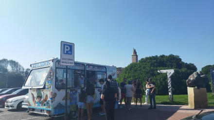 Con más de 33ºC, el puesto estrella del otoño en la calle Real se retrasa. Sus propietarios deciden prolongar su empleo de verano, el furgón de los helados