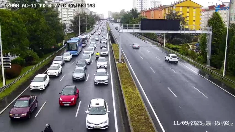 Los vehículos ocupan el carril izquierdo de la vía en un momento de mucha circulación, lo que ha causado un importante atasco. Una hora después del siniestro, la cola todavía llega a la altura de las Pajaritas.