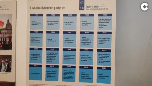 El Parlamento de Galicia tiene actualmente 75 escaños y ha impulsado unas 500 leyes en su historia. De la Ley de Normalización Lingüística de 1983 a la de ordenación del territorio, de 2021, en la muestra se pueden ver las grandes normativas impulsadas en cuatro décadas.
